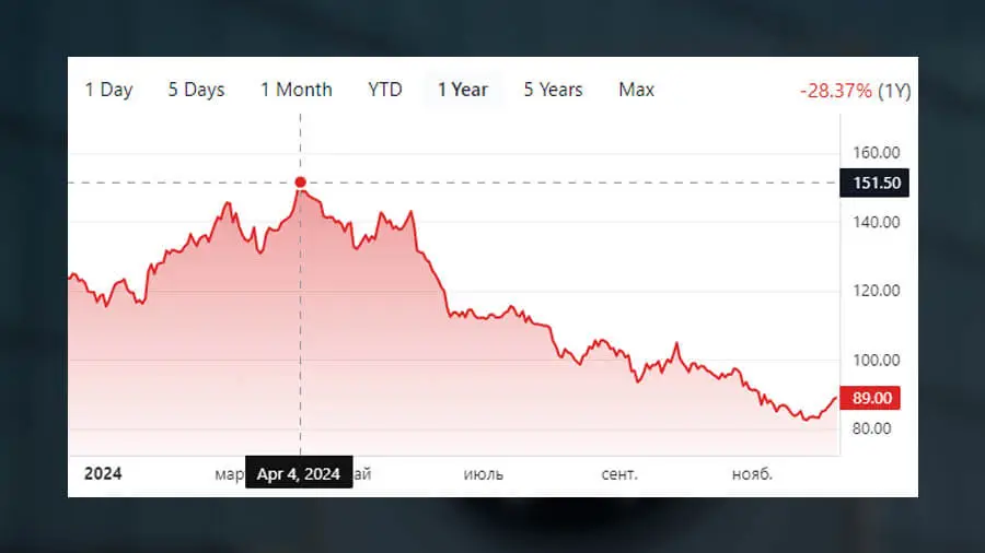 Volkswagen AG акциялары 2024 жылдың сәуірінен 151 млрд. АҚШ долларынан, желтоқсанның 10 арасында 89 млрд. АҚШ долларына құлдырады